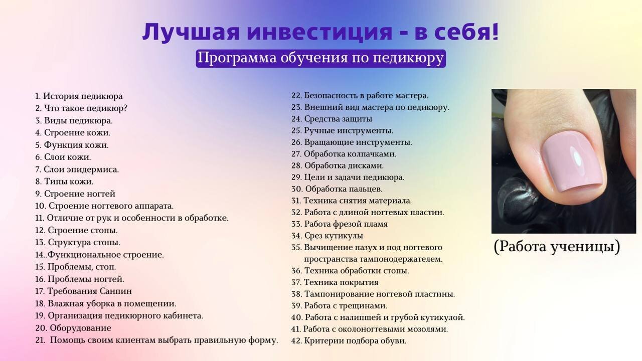 Преимущества: Прошла обучение в данной школе с нуля, есть теория, но основное обучение естественно проходит на практике, моделей и все необходимые ресурсы школа предоставляет, за время практики можно не только научиться делать чистый маникюр/педикюр, но и наработать скорость ! Хочу выразить огромную благодарность Александре и Наталье за обратную связь, терпение, ценные рекомендациии и помощь в освоении новой профессии . На фото моя первая и одна из моих последних работ .