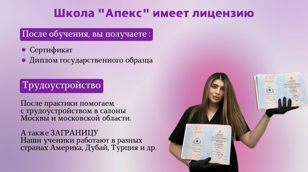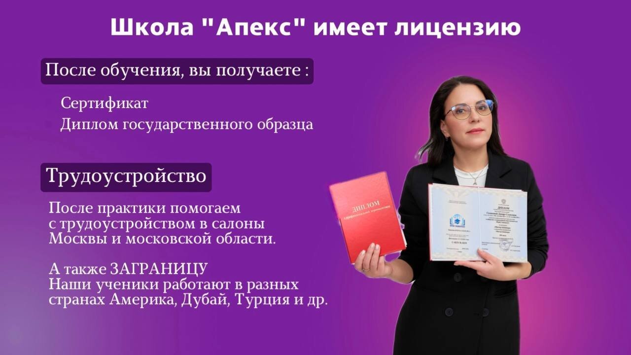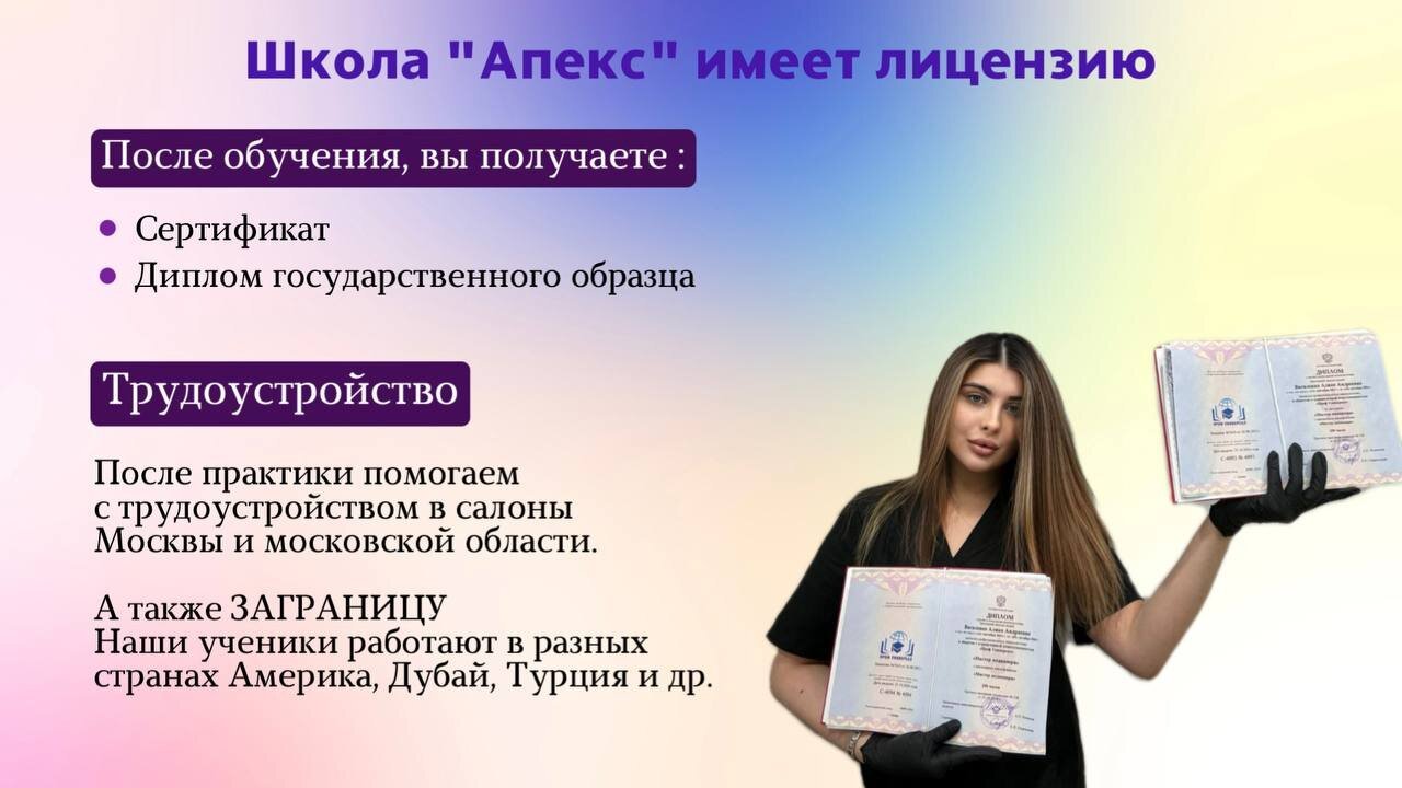 Хочу выразить огромную благодарность преподавателям школы Алекс Александре и Наталье за учёбу,за ваш профессионализм,за терпение,обстановка в школе тихая спокойная,моделей очень много.Спасибо школе Апекс за учёбу,я рада что училась именно у вас,вы лучшие.Всем рекомендую.